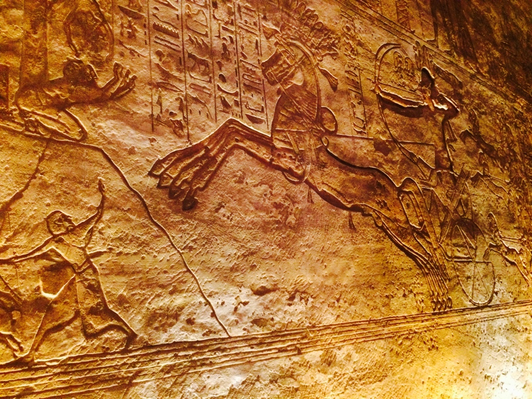 A l’interior del temple està prohibit fer fotografies però hi podem veure la sala de columnes amb figures de Ramsès II en postura osírica i tot l’interior està decorat amb escenes en les que Ramsès II surt victoriós en lluites i batalles o derrotant els seus enemics, sempre ajudat pels déus, com en el cas del carro de la imatge en el que es pot veure que el cavall té les potes duplicades i també el braç i l’arc son dobles, simbolitzant que Ramsès era ajudat per la mà dels déus.