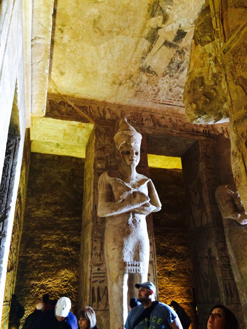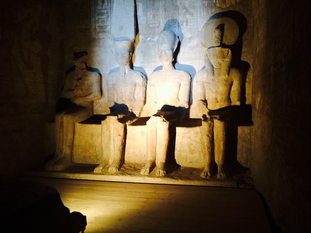 Al santuari hi ha les figures de tres déus i Ramsès II és la quarta. En l’emplaçament original ens explica el guia que entrava la llum del sol fins al santuari dos dies a l’any, un a l’octubre i l’altre al febrer, coincidint amb les dates de coronació i naixement de Ramsès II. En el nou emplaçament també passa però un dia més tard.