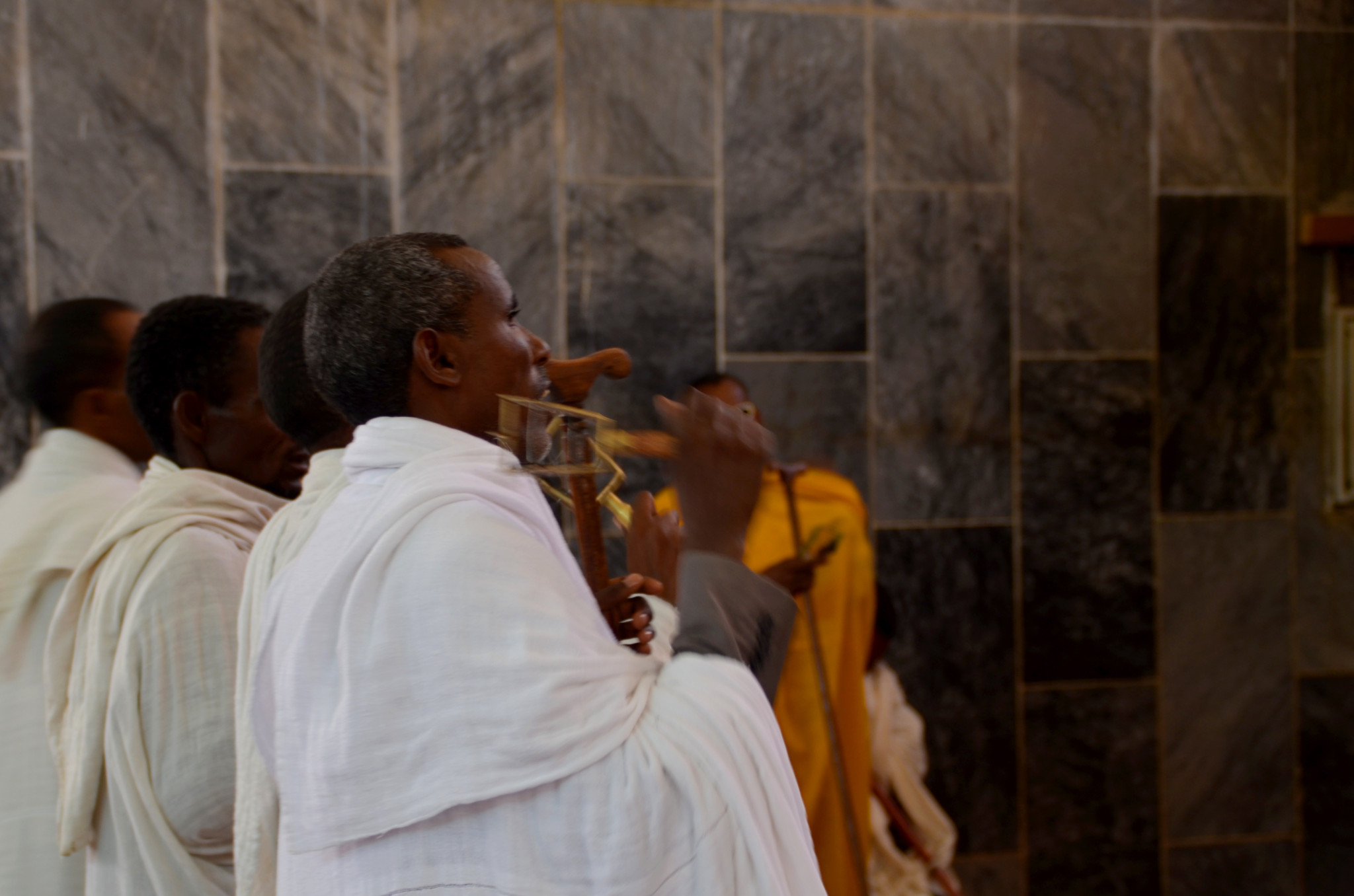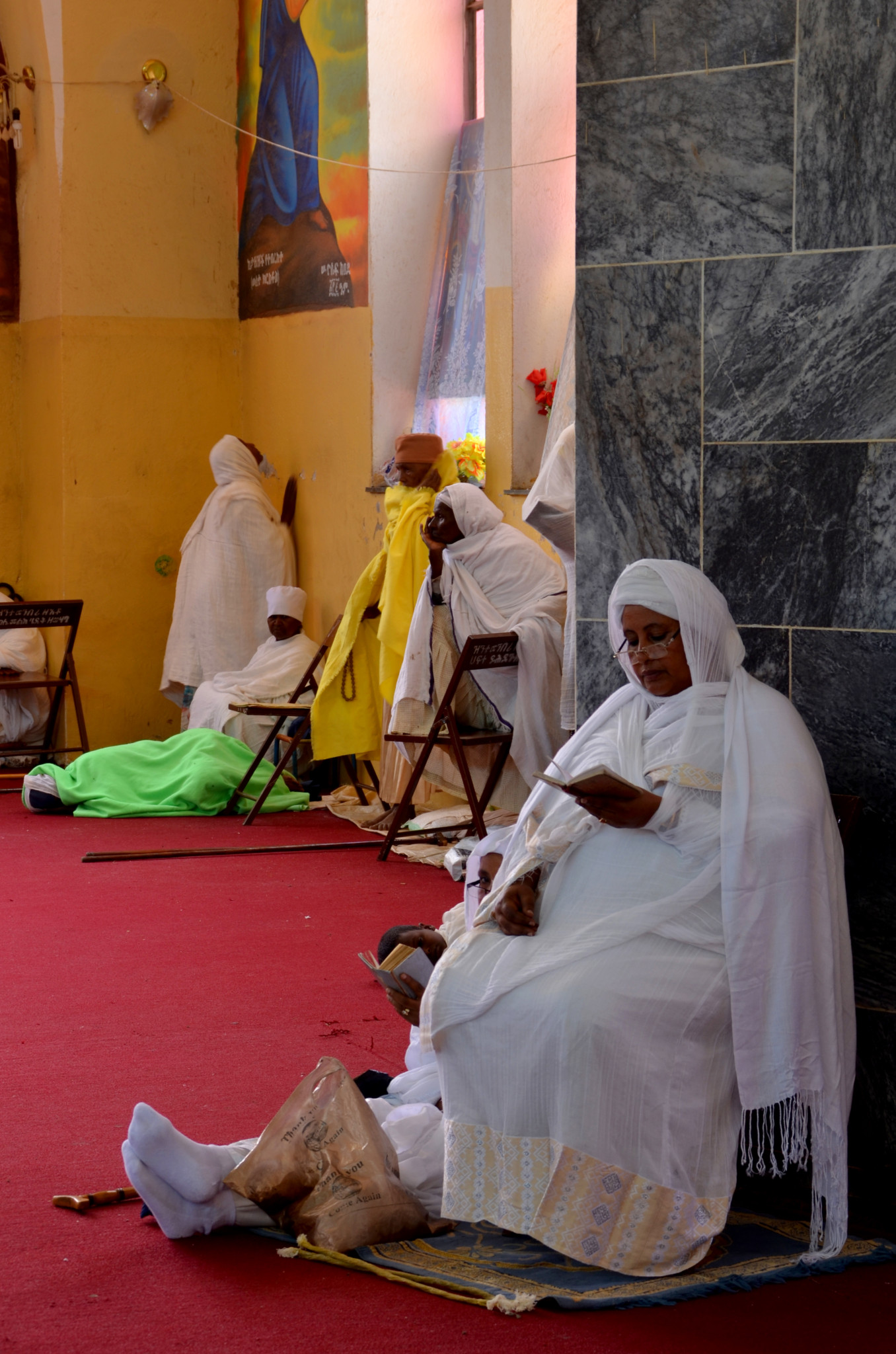 A l’hora que hem entrat al recinte de la catedral d’Axum comença la cerimònia. Podem veure com la gent, pietosa, s’arrenglera en els bancs o al terra, les dones a la dreta i els homes a l’esquerra. Al fons, un grup d’homes canten, molts d’ells son molt grans, i toquen curiosos instruments que sonen com una pandereta sense picar la part de pell. Al terra, un nen va tocant un gran tambor. La veritat que s’hi estan una bona estona i ens permeten contemplar la seva fe. Els creients van tots coberts amb un mocador blanc que els tapa el cap i el terç superior del cos. Algunes dones el porten groc, son monges.
