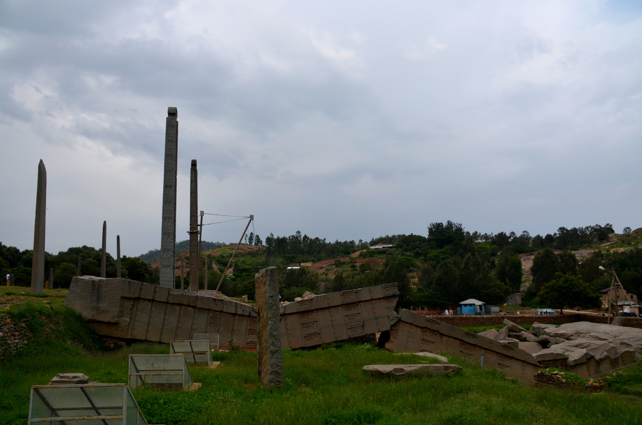 En acabar ens dirigim de nou a la zona on es troba la catedral per veure el que hem deixat pendent abans per la pluja: el camp d’estel.les. En aquest camp hi ha més de 75 monòlits de diverses formes i tamanys. Gegantins monòlits s’enlairen i dominen totalment la nostra mirada. El més gran que es manté dempeus s’atribueix al rei Ezana i es un bloc de granit sòlid que fa uns 23 metres d’alçada. No hi ha cap explicació clara de com aquests monòlits van poder ser posats drets. Hi ha qui diu que va ser pels poders de l’Arca de l’Aliança.