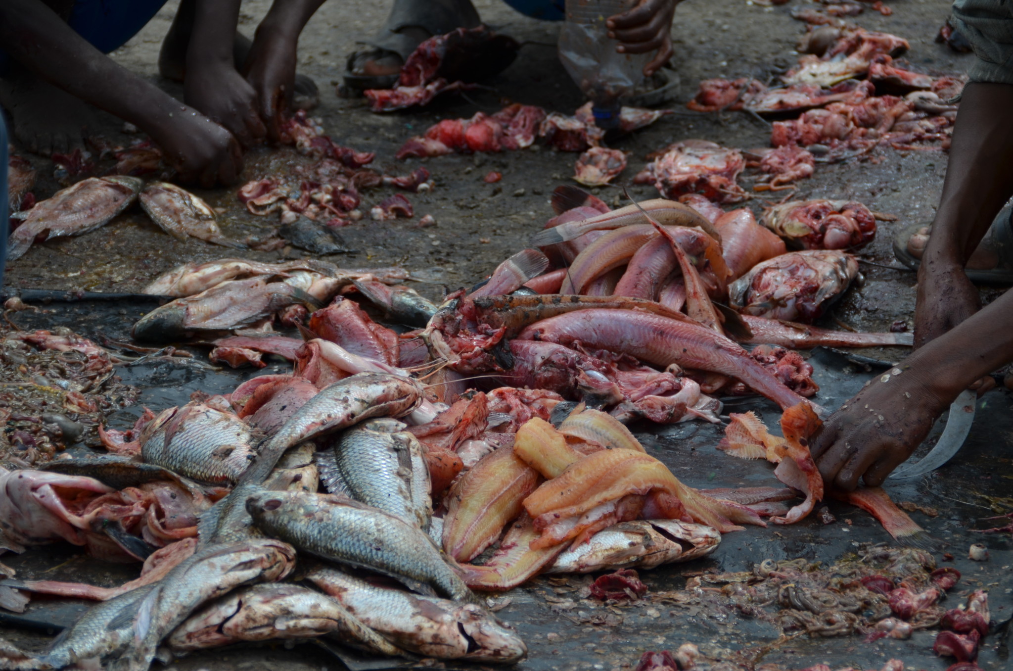 Les destres mans d’aquest nen treuen les tripes al peix que han capturat en la seva barca amb rapidesa